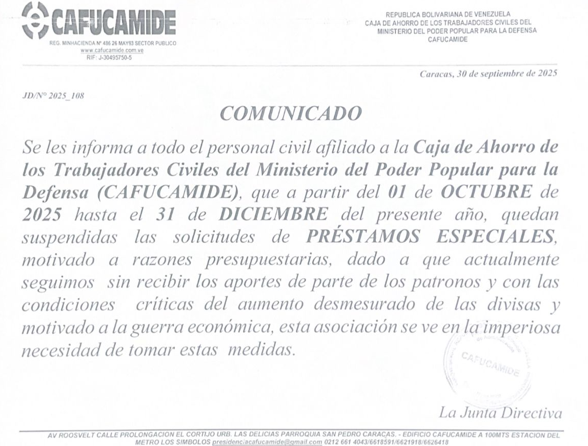 DIRECTIVOS ELECTOS PERIODO 2025-2028 CAJA DE AHORRO DE LOS TRABAJADORES CIVILES DEL MINISTERIO DE LA DEFENSA Nuestros Servicios Servicio de Previsión FunerariaProteja a su grupo familiar con el Servicio de Previsión Funeraria CAFUCAMIDE. Préstamos OrdinariosCAFUCAMIDE ofrece a sus asociados préstamos en sus diferentes modalidades. Ahorro SocioComo asociado de CAFUCAMIDE podrás ahorrar un porcentaje de tu sueldo básico.